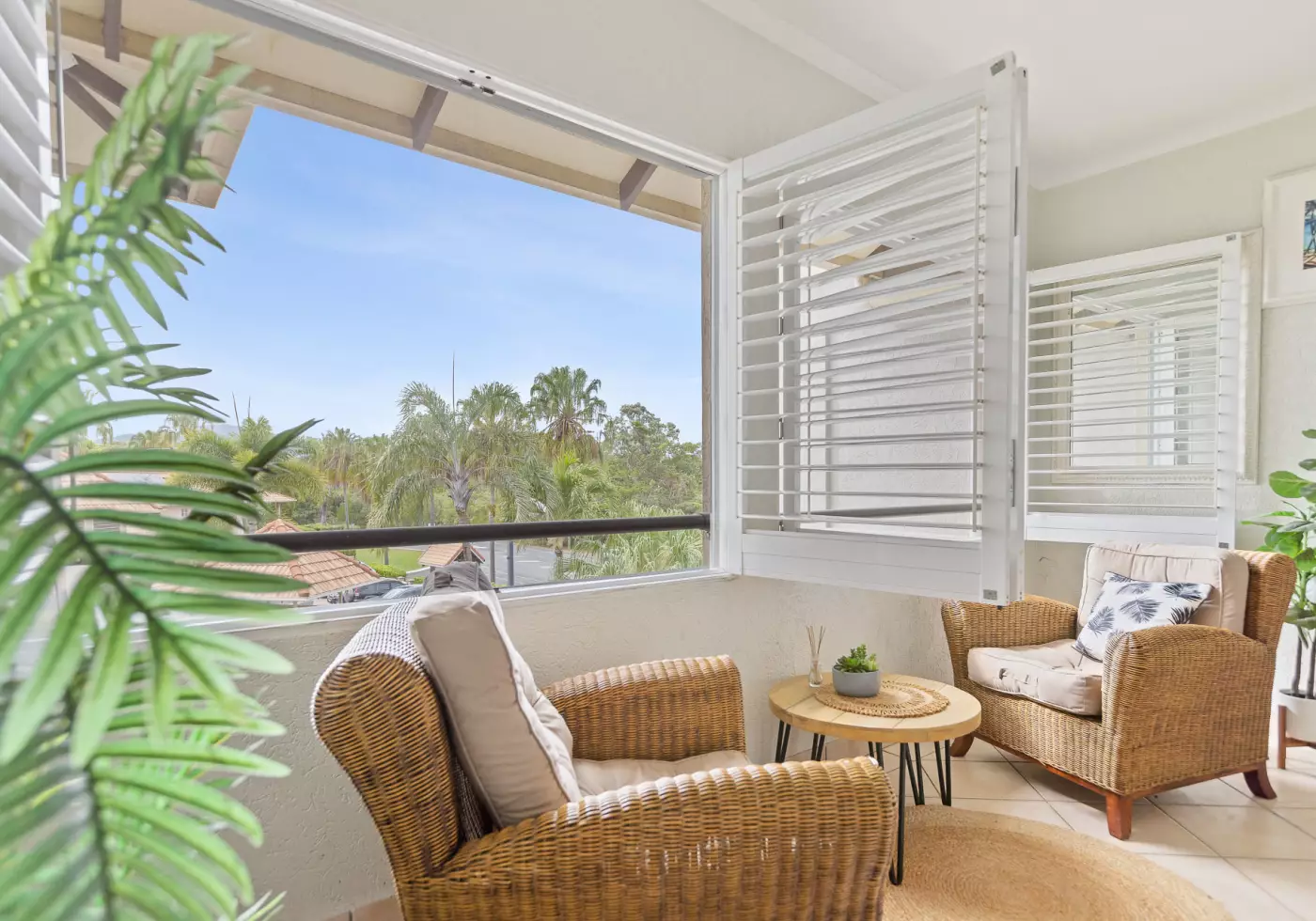 Set within the highly sought-after "The Lakes Resort," this furnished second-floor apartment offers the perfect balance of lifestyle and convenience. Designed with everyday comfort in mind, the home features an open-plan layout that extends to a generous patio, fitted with shutters that can be enclosed for added privacy and year-round use.