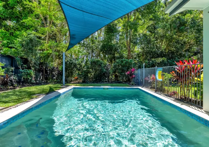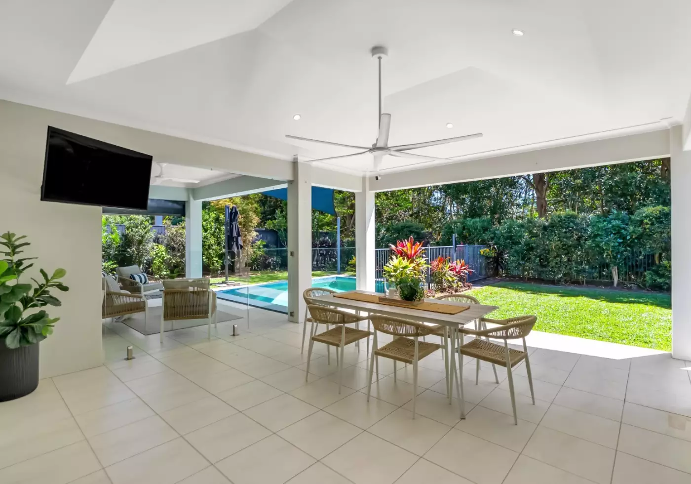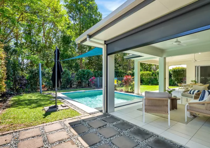 The open-plan living and dining areas flow seamlessly to the sleek kitchen, boasting a large eco-stone island bench, 900mm gas stove top and electric oven, and dishwasher. The showstopping covered alfresco area – complete with outdoor TV, speaker wiring, LPG gas tap for your BBQ and a unique raked roof – overlooks the sparkling 6 x 4m swimming pool and lush rainforest backdrop, creating an idyllic entertainer's paradise.