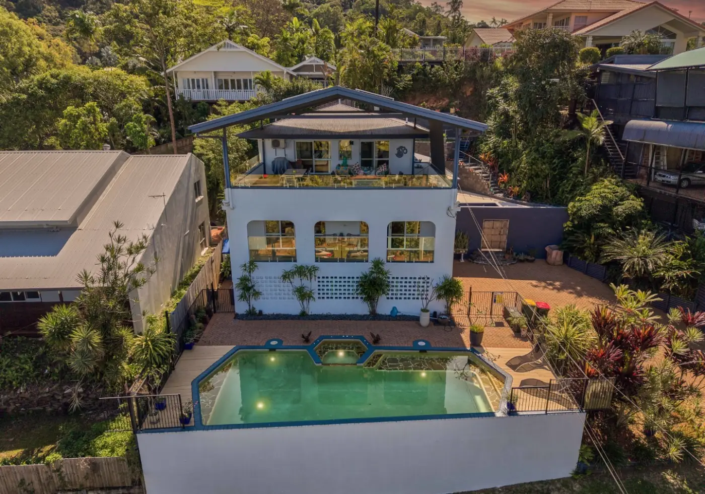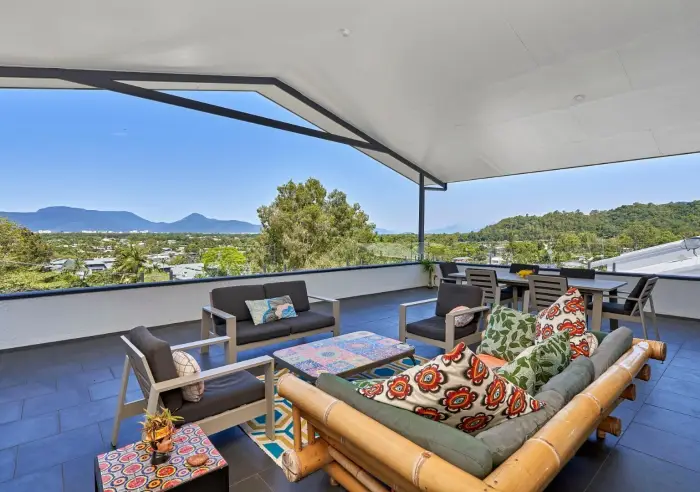High above Cairns on one of Whitfield's most exclusive streets, this substantial low maintenance residence stands as a rare offering of scale, space and style. Built to endure and crafted to impress, the home rises proudly over three expansive levels, commanding panoramic 180° views across the city skyline, the Coral Sea and all the way to Walsh's Pyramid.