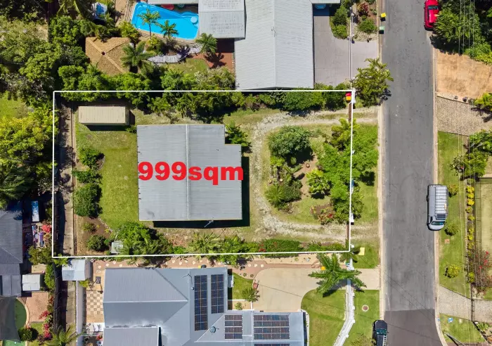 Privately positioned behind an impressive feature wall with dual custom electric entry gates, the home rests on a huge 999sqm fully fenced block surrounded by lush tropical gardens and fruit trees.