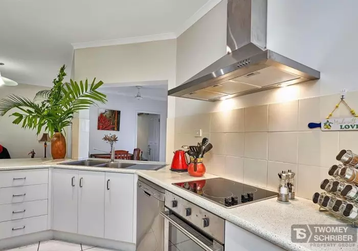 • Well-equipped kitchen featuring a servery to the dining area, stainless steel rangehood, dishwasher, and a large pantry