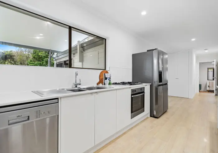 - Centrally located, functional walk-thru kitchen with stone benchtops