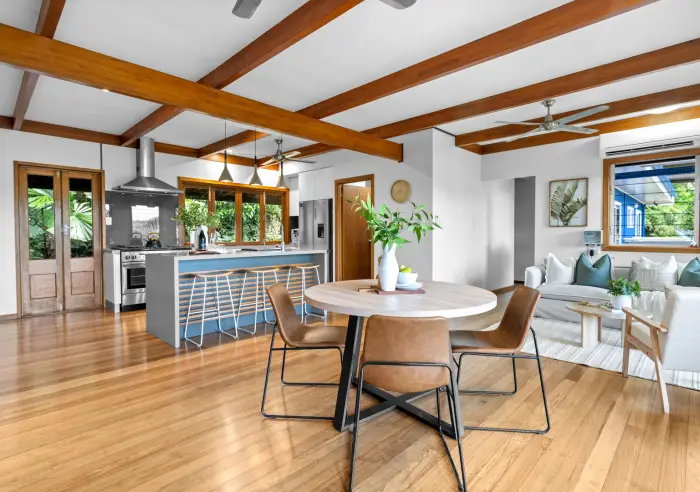 This remarkable 4-bedroom, 3-bathroom property combines timeless elegance and modern functionality. From the moment you enter, you'll be captivated by the sheer grandeur of this home. Polished hardwood timber floors, exposed ceiling beams, and soaring, airy spaces create a sense of sophistication and warmth that flows throughout.