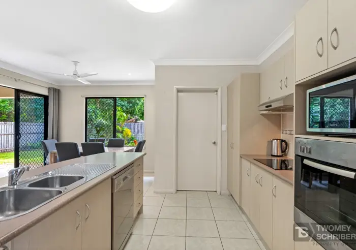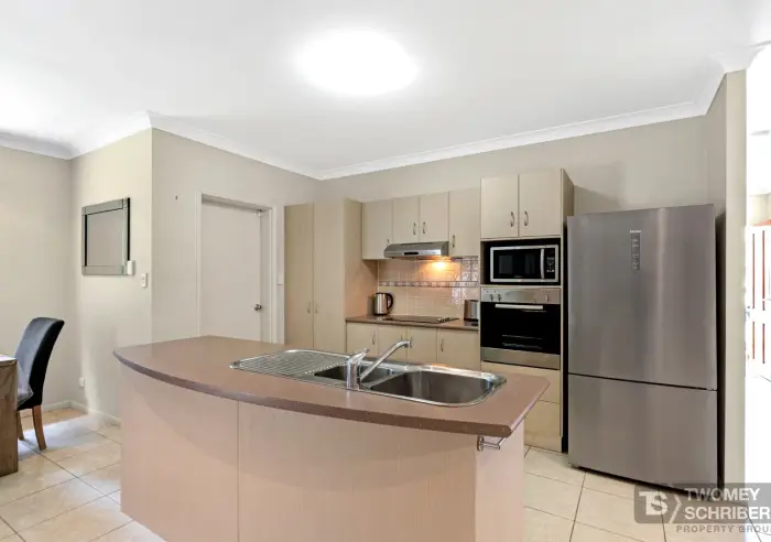 • A stunning chef's kitchen boasting a stand-alone island bench, double sink, dishwasher, stylish tiled splashback, and ample storage